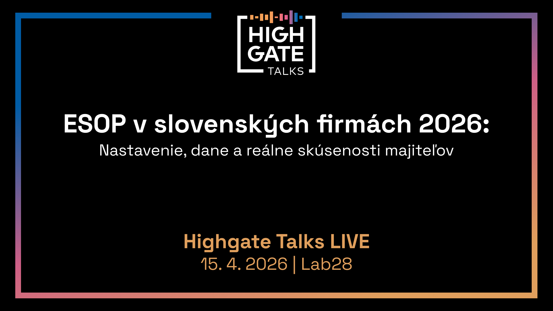 Vzhľadom na aktuálnosť tejto témy sme sa aj v roku 2026 rozhodli zorganizovať unikátny a praktickými informáciami nabitý event špeciálne zameraný na tému nastavenia ESOP programov v slovenských firmách. Okrem zaujímavej diskusie a prednášok týkajúcich sa nastavenia a zdaňovania jednotlivých foriem ESOP podielov Vás bude čakať podcast Highgate Talks naživo, kde sa budú Tomáš Demo a Peter Varga rozprávať s Jurajom Hrbatým (CEO a zakladateľ Finax) o tom, ako funguje ESOP program vo Finaxe. Rovnako sa dozviete, ako funguje unikátny odmeňovací systém v Highgate Group (Šťastná 13) a aké možnosti prináša aj pre iné firmy.